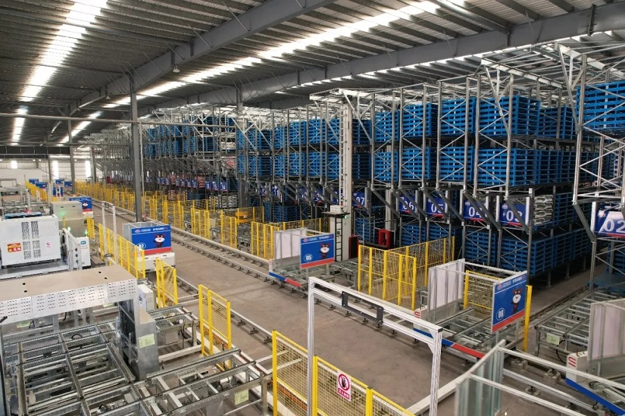 在核心智能设备投入上,安得智联部署了重载堆垛机、环形穿梭车RGV、垛型整形机和自动翻板机等先进设备,并通过立库WCS系统实现设备的智能调度与控制,确保从产品下线、入库存储到出库装车的全流程24小时无人化作业。通过科学分区设计,立体库货架总库位增至9000多个,最大化利用空间;堆垛机系统涵盖9台直轨堆垛机和1台转轨堆垛机,最大载重达2吨,巷道最长115米,保障高效出入库流量。